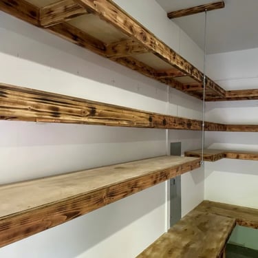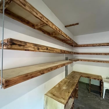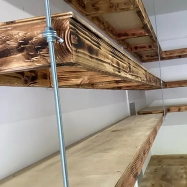 To elevate the look of the space, we lightly torched the studs to highlight the natural grain and applied a rich stain for a warm, rustic finish. The combination of durability and clean craftsmanship makes this garage more functional, organized, and visually appealing.